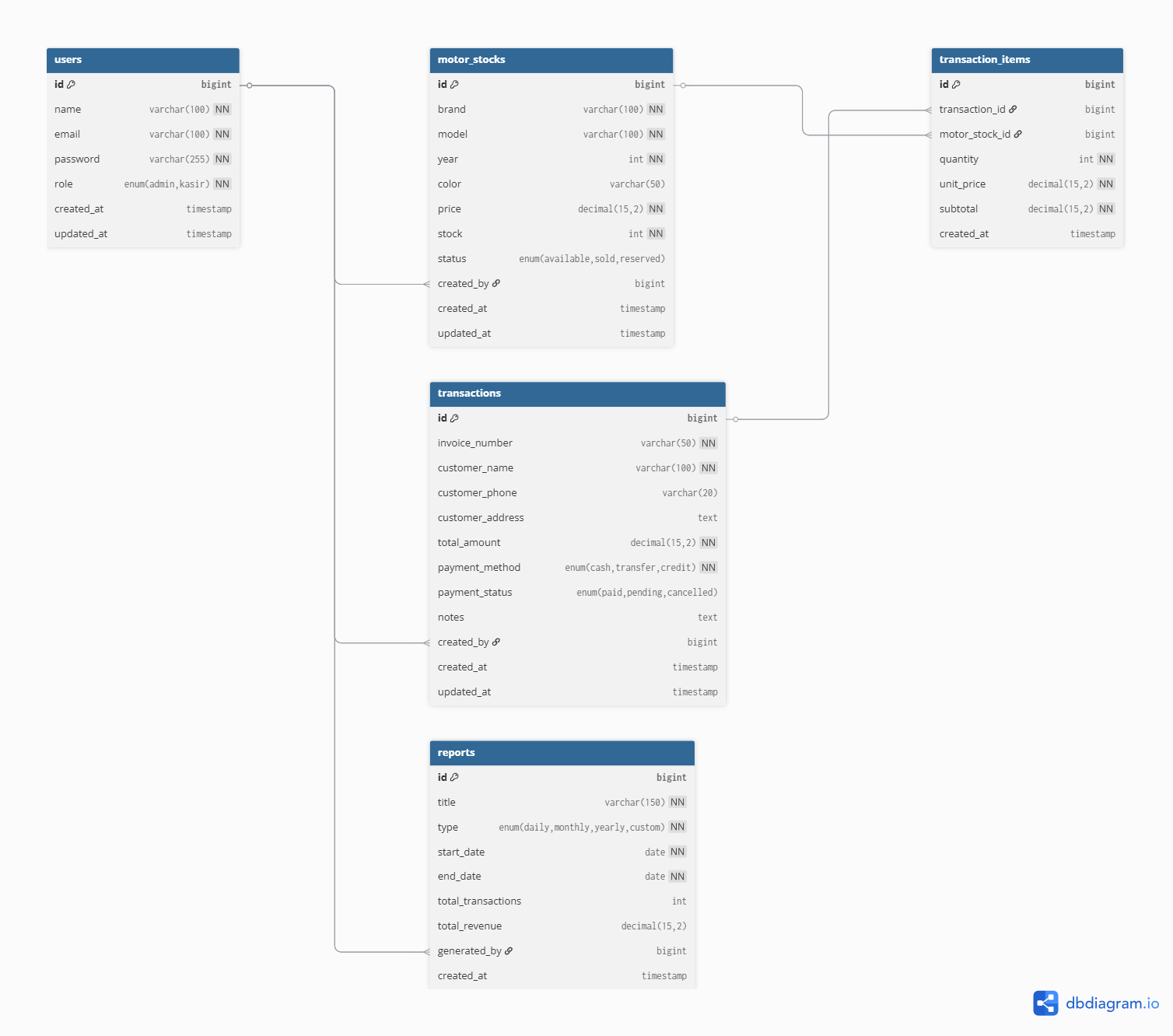 - Stock Management — Add, update, and monitor motorcycle inventory in real time, including unit details and availability status.